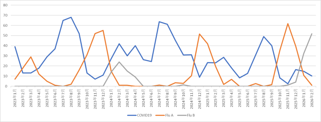 令和8年2月までの新型コロナとインフルエンザの当院PCR検査陽性率推移 2026.03.5 インフルエンザ, 新型コロナウイルス 新型コロナは陽性率低下が継続しており、ピークは過ぎたものと思われます。インフルエンザB型は陽性率50%超と高値を示しています。昨年シーズンは最大で1.5%、一昨年シーズンも最大で25%弱でしたので、今シーズンはインフルエンザB型が猛威を振るっていると言えます。3月からの推移に注目しましょう。 インフルエンザ, 新型コロナウイルス PCR検査, インフルエンザ, 新型コロナ 自宅での新型コロナの抗原検査の注意点前の記事